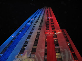 A New-York, le fameux Rockefeller center etait tres certainement la place a plus animee pour suivre les elections en direct. La partie gauche du gratte-ciel etait eclairee en bleu (representant le parti Democrate - Obama) et projetait la msnbc en direct sur ecran geant. Le centre etait eclaire en blanc. La partie droite etait eclairee en rouge (pour le parti Republicain – McCain) et projetait la nbc. Des drapeaux marques de '270' etaient places a mi hauteur de l'immeuble et des nacelles representant chaque parti montaient progressivement vers l'objectif 270 au fur et a mesure que les resultats etaient communiques. Chaque progression des democrates provoquait des cris de joie alors que les republicains ne recevaient que des 'houuu'! La force des democrates s'est tres vite fait ressentir et apres quelques heures le score se retouvait a 200 pour Obama a 130 pour McCain. L'annonce des resultats de la Cote ouest a litteralement projete le le parti democrate au dela des 270 et la joie des New-Yorkais explosa! (Max)